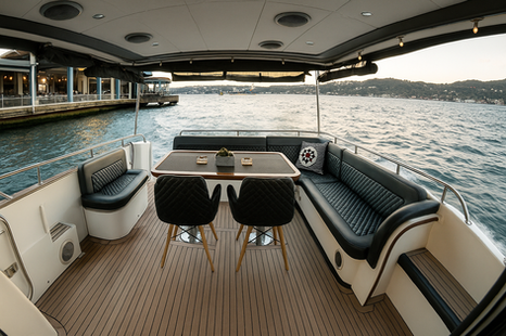 Gurme Kaçamaklar: Geniş ve kullanışlı arka güvertesi, şık bir akşam yemeği veya sofistike bir kokteyl saati için deniz üzerindeki en iyi masadır.